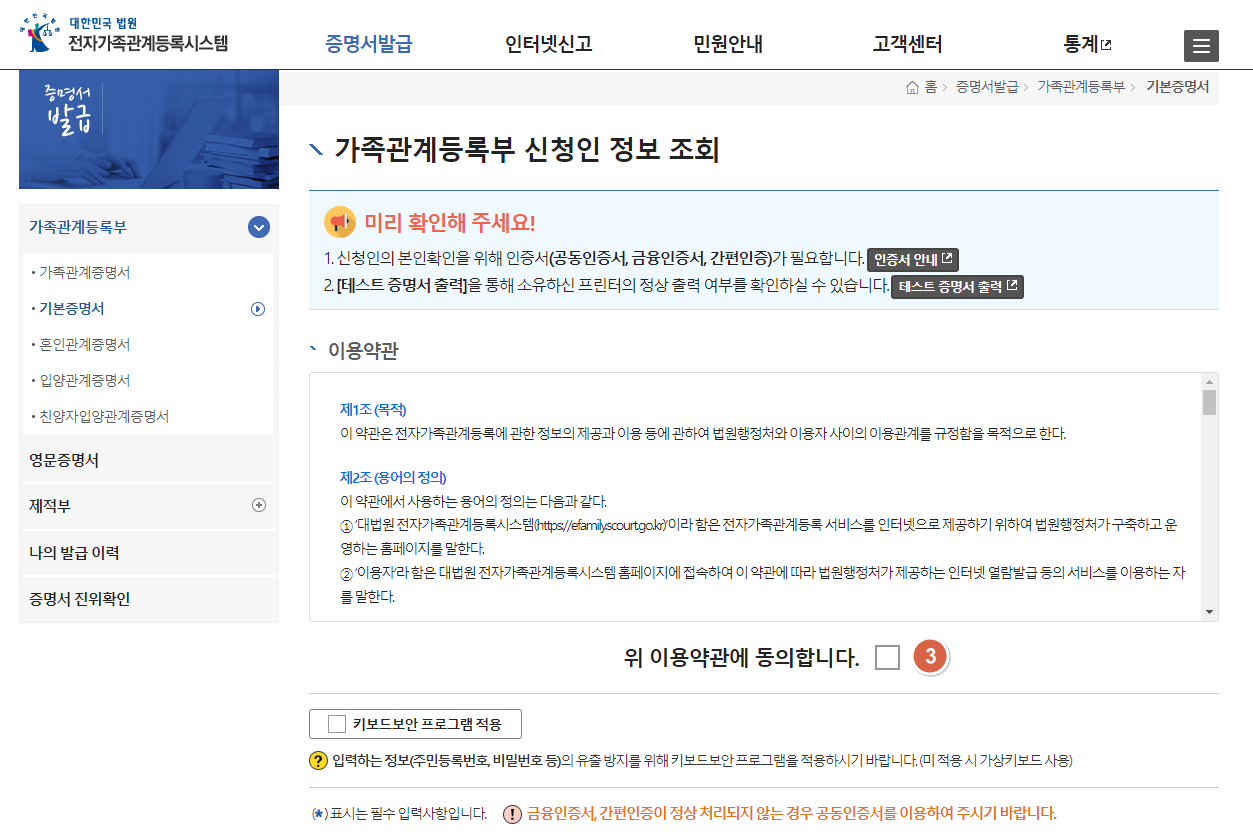 마지막으로 기본증명서발급의 신청대상자를 선택해줍니다.