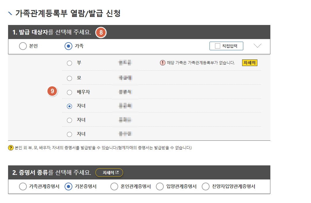 전 자녀들의 기본증명서가 필요했던 경우라서 자녀를 선택했습니다.