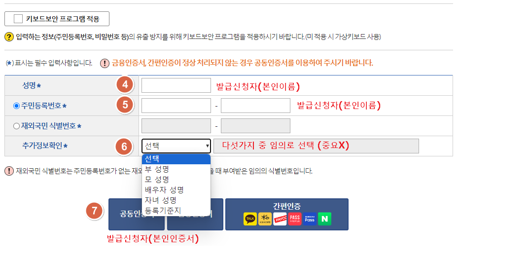 예를 들어 남편의 인증서로 발급 받으려 한다면 성명란에 남편의 이름을 입력해야 합니다.