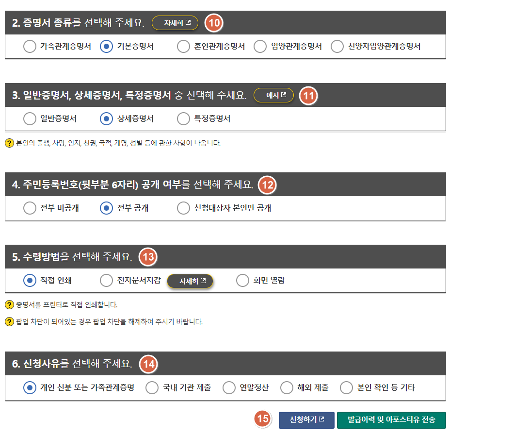 마지막으로 기본증명서발급의 신청대상자를 선택해줍니다.