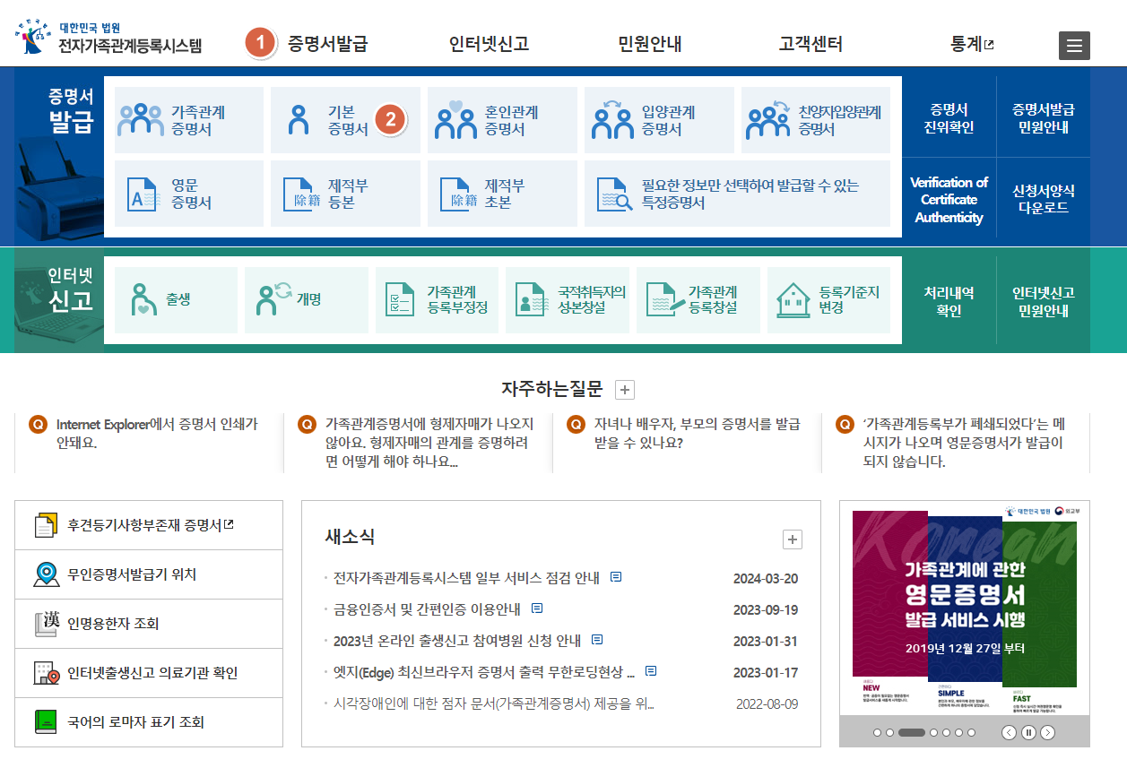 먼저 전자가족관계등록시스템 홈페이지에 접속합니다.