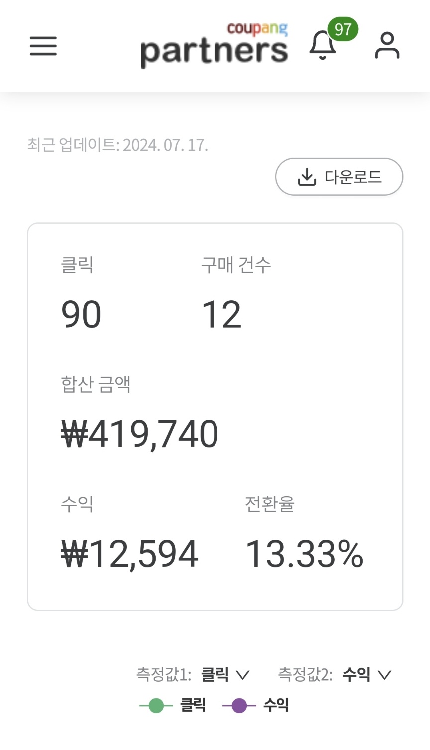 꼭 쿠팡P앱을 통해 물건을 구입해야 수수료 수익이 잡히게 됩니다.